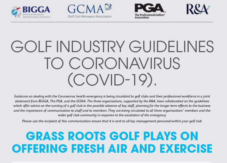 Further guidance on dealing with the Coronavirus health emergency is being circulated to UK golf clubs and their professional workforce in a joint statement from BIGGA, The PGA, and the GCMA. The three organisations, supported by the R&A, have collaborated on the guidelines which offer advice on the running of a golf club in the possible absence of key staff, planning for the longer term effects to the business and the importance of communication to staff and to members. They are being circulated to all three organisations’ members and the wider golf club community in response to the escalation of the emergency