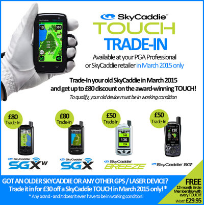 In March 2015, golfers are invited to trade-in an old SkyCaddie for up to £80 discount on a brand-new, top-of-the-range SkyCaddie TOUCH GPS handset – winner of Golf Monthly magazine’s Best Premium GPS award in its February 2015 issue.