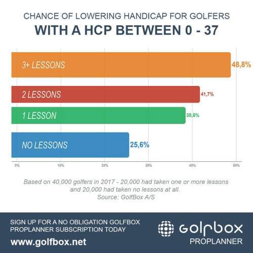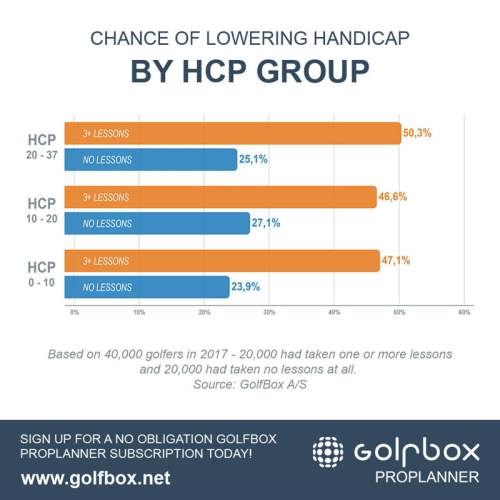 GolfBox’s lesson management product (ProPlanner) has provided insight into the correlation between individual game performance and professional golf lessons. Over 2017, ProPlanner captured data from 20,000 golfers who had booked one or more lessons through the platform. The captured data established a positive trend between number of lessons booked and the chance of lowering handicap percentage (HCP). GolfBox identified the correlation when they analysed the captured data against a control group sourced from the same geographical region.
