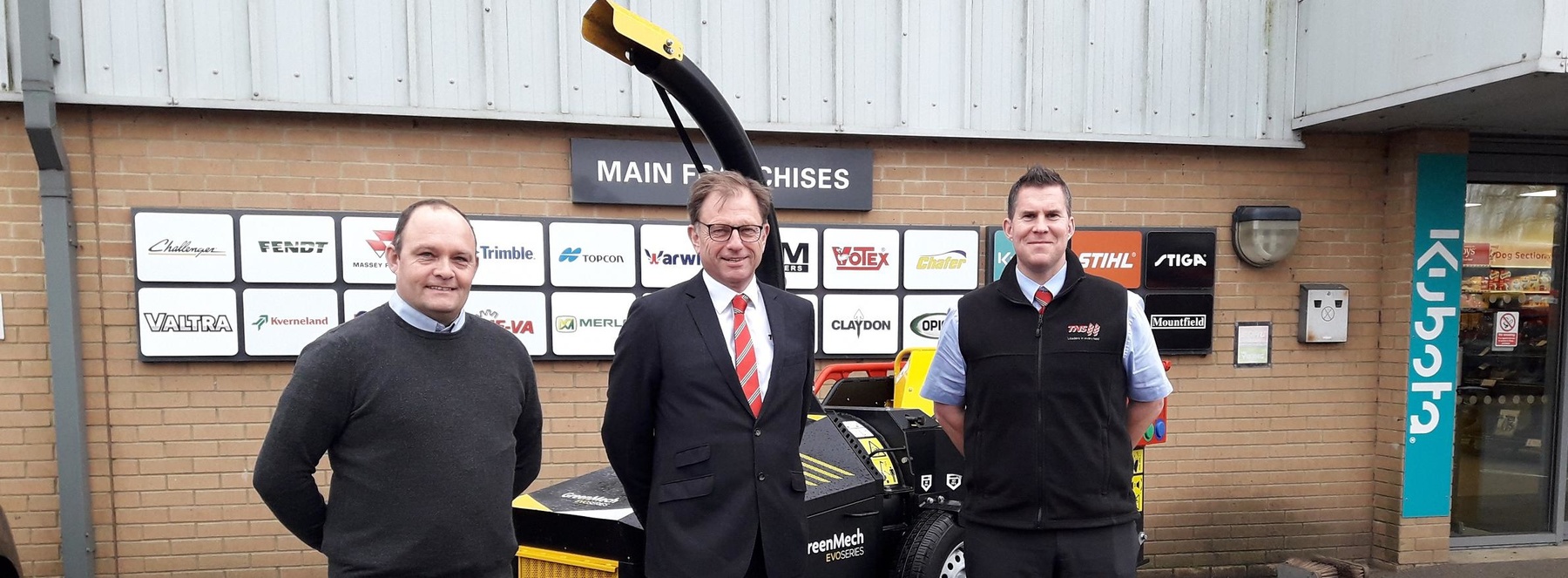 Pictured top (from left): Julian Cullis of GreenMech, with TNS Sales Director Chris Tew and Matt Bailey, Suffolk Groundcare Sales Manager