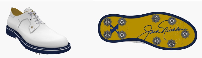 The Legacy Pro ($249 USD) is a white, plain toe shoe with navy outsole. It will feature a heel counter with a gold pin depicting the iconic Golden Bear logo and the Jack Nicklaus Signature trademark on the outsole. The Heritage Malaga ($449 USD) is a white, wingtip shoe showcasing the Golden Bear logo in the center of the outsole. The Legacy Pro and Heritage Malaga are both full-grain leather, water-repellant and equipped with FTS 3.0 cleats by SoftSpikes.