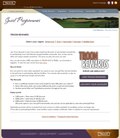 Status levels include Silver, Gold and Platinum, with each level providing a different percentage discount on golf fees and merchandise. Each point towards the Troon Rewards program is equivalent to a dollar spend (USD) and upon reaching 2,000 points in a calendar year, members become automatically eligible. Elite status begins with Silver level and a 10% discount on golf and merchandise purchases; Gold level is reached at 4,000 points and members are rewarded with a 15% discount; at the highest Platinum level, members receive a 20% discount for earning 8,000 points. Plus, at every 500 point interval members receive a certificate towards a free round of golf at any participating facility managed by Troon Golf.