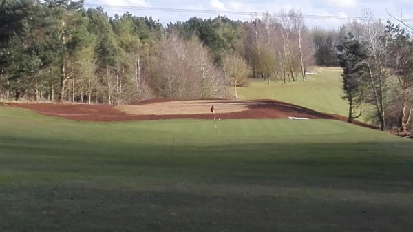 Finally to hole 13 which we extended from a difficult par 4 to a difficult par 5.When we first looked at the opportunity of extending the green forward I noticed there was a magnificent Ash tree around which the approach to the green could be designed – yet nobody seemed to realise that it was even there ! We had to remove a couple of weak hawthorns either side of the ash but as soon as we did there it was, a magnificently shaped and mature ash tree. Of course the problem with designing around trees, and one of the first things I was taught at landscape college, is that trees have a finite life span ( ash trees perhaps more than most ), but let us hope it stays there for another 100 years and continues to be the talking point of the hole. Whereas before the green for this former long and difficult par 4 was blind and very small, now it is perfectly visible along the entire fairway, and is set naturally into an upslope so was relatively easily constructed.