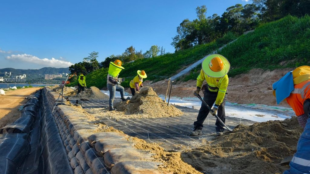 Temporary drain channels have also been created on top of the reinforced fill slope to collect surface runoff water, preventing water from pooling inside the filling area and instead enabling its flow to percolate through the geotextile filter to achieve the accepted water quality according to government policy.