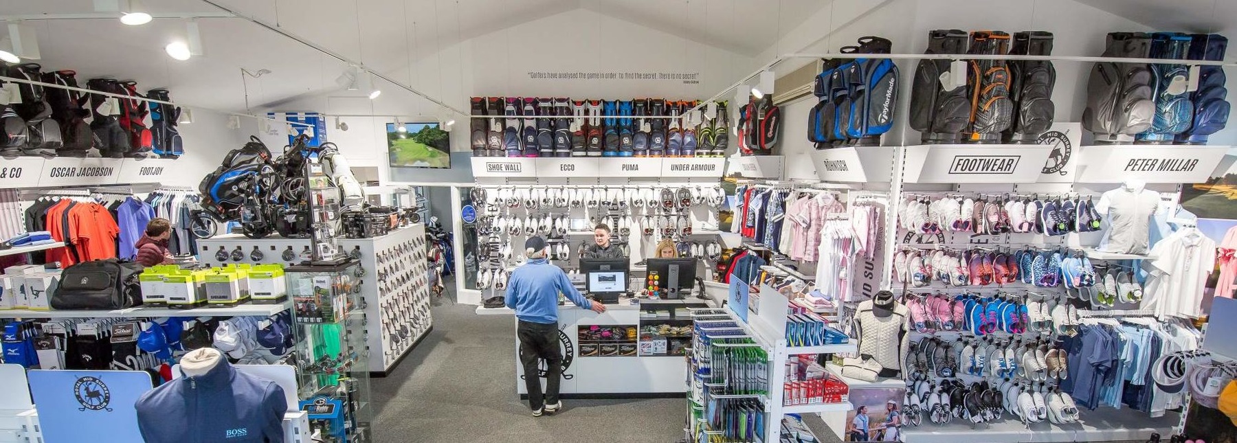 Innovations include a square club stand that houses 250 individual clubs; a dedicated wall with golf shoes displayed in pairs rather than individual models; ten iPads for customers to view colour options, rather than take the sale elsewhere; and three TV screens for marketing that also feature a flyover video of the course. There are eight resident PGA Professionals at the shop, plus a retail assistant.