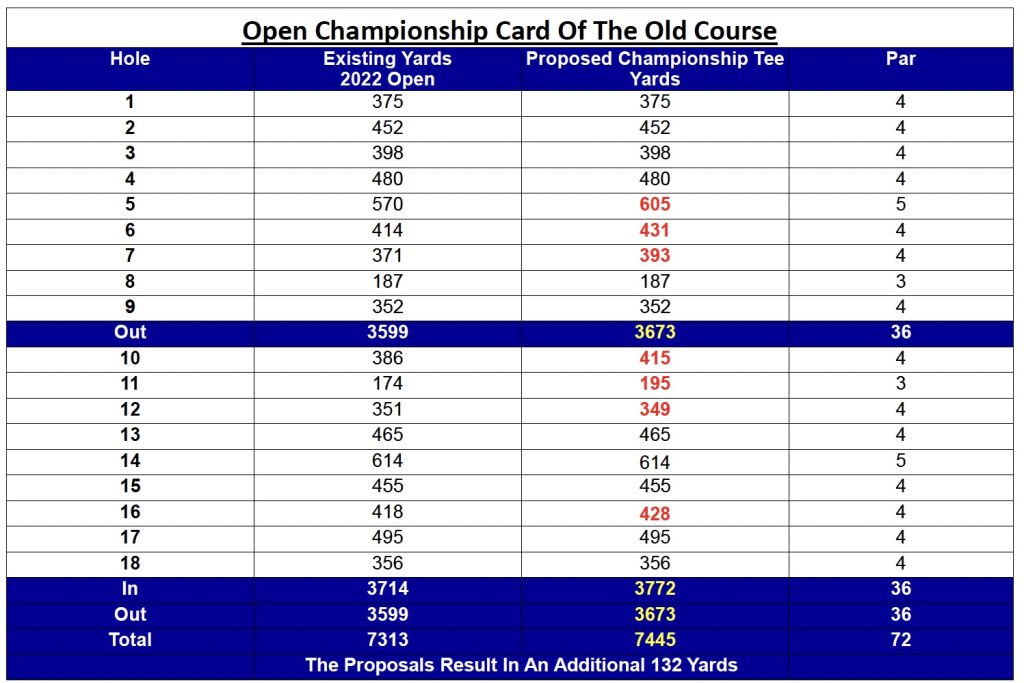 Six holes will be lengthened – the 5th, 6th, 7th, 10th, 11th and 16th – while one will be shortened slightly – the 12th. The overall championship yardage of the course will increase by 132 yards to 7,445 yards. New championship tees will be created on the 5th, adding 35 yards, the 6th, adding 17 yards, the 7th, adding 22 yards, and the 10th, adding 29 yards. Tee enlargements will see increases in length at the 11th (21 yards) and the 16th (10 yards).