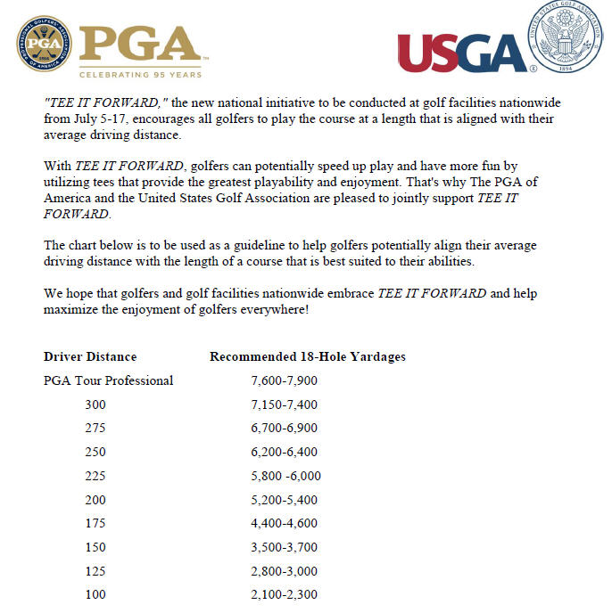 “All of us deeply involved in the game constantly encourage golfers of all skill levels to play the proper tees, but too often golfers want to bite off as much of the golf course as they can. What ends up suffering is their scorecard and their overall enjoyment. This program should help stimulate people to play the proper tees and maximize the golf experience.”
