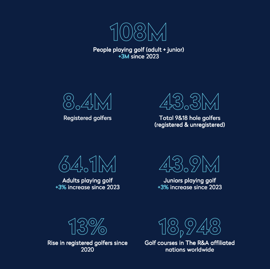 With combined adult and junior data released for the first time in the 2024 Global Participation Report, there are 108 million adults and juniors playing golf across all formats of the sport in The R&A’s affiliated markets – an increase of almost three million golfers since 2023.