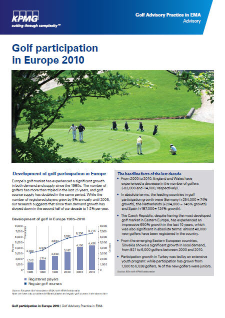 KPMG’s Golf Advisory Practice today publishes its Golf Participation in Europe 2010 survey, which highlights significant demand and supply changes in the European golf market, headlined by last year’s 4% decrease in the number of players in the UK and Ireland.