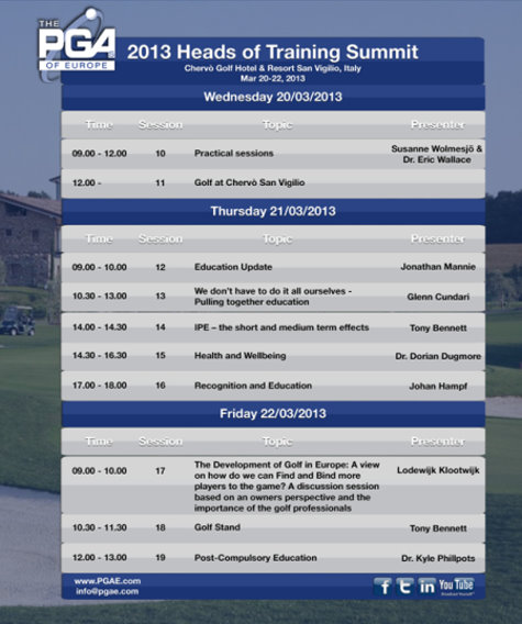 The final day of sessions will include a look at the development of the game in Europe with European Golf Club Owners Association Director, Lodewijk Klootwijk; as well as an explanation of the outcomes to the pan-European Golf Stand Project with Tony Bennett; culminating with a discussion around ‘post-compulsory education’ with the PGA of Great Britain & Ireland’s Director of Education & Career Development, Dr. Kyle Phillpots.