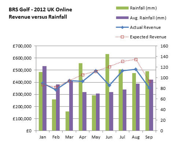 BRS Golf, developer of the UK & Ireland’s market leading online booking and tee time management system, has compared the UK online revenue figures for 2012 to date of £3.8 million from their 720 customers, against the rainfall statistics from the Met Office.