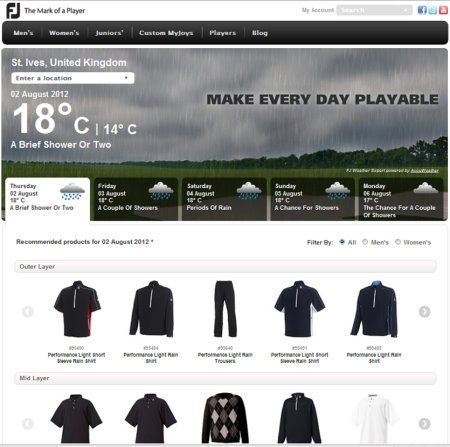 “The thinking behind the FJ Weather Expert was to create a portal where our loyal following of FJ enthusiasts could make sure they were never caught out on the golf course with inappropriate clothing, footwear, gloves and accessories,” commented Russell Lawes, European Marketing Manager – FootJoy. “FJ has always had a fantastic reputation for bringing high-tech, performance driven outerwear to the market and with the help of this fantastic micro-site we are now able to take this one step further and enhance the golfers’ on-course experience.”