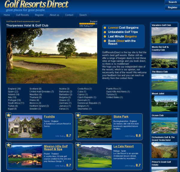 The website carries special offers, which can be customised for the resort’s own corporate sponsors. By offering the lowest possible prices, GRD guarantees to find resorts more customers without any third party commissions.