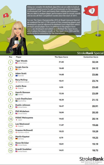 Ahead of the Open, a special form guide was compiled which weighted the actual form score for the championship by 70% and players’ past performances in the Open by 50%.The result was that Stroke Rank successfully ranked Rory McIlroy, Adam Scott and Sergio Garcia in the top five.