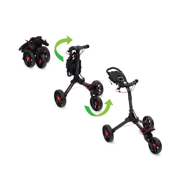 The trolley boasts ‘auto open cart’ technology, which sees a pair of nitrogen-powered pistons transforming it from a compact folded cart to open and ready to go in seconds, while the front wheel also automatically pops out into place. Folding the Nitron is also a simple two-step process, with the unit collapsing in seconds to a compact size, ready to be stored.
