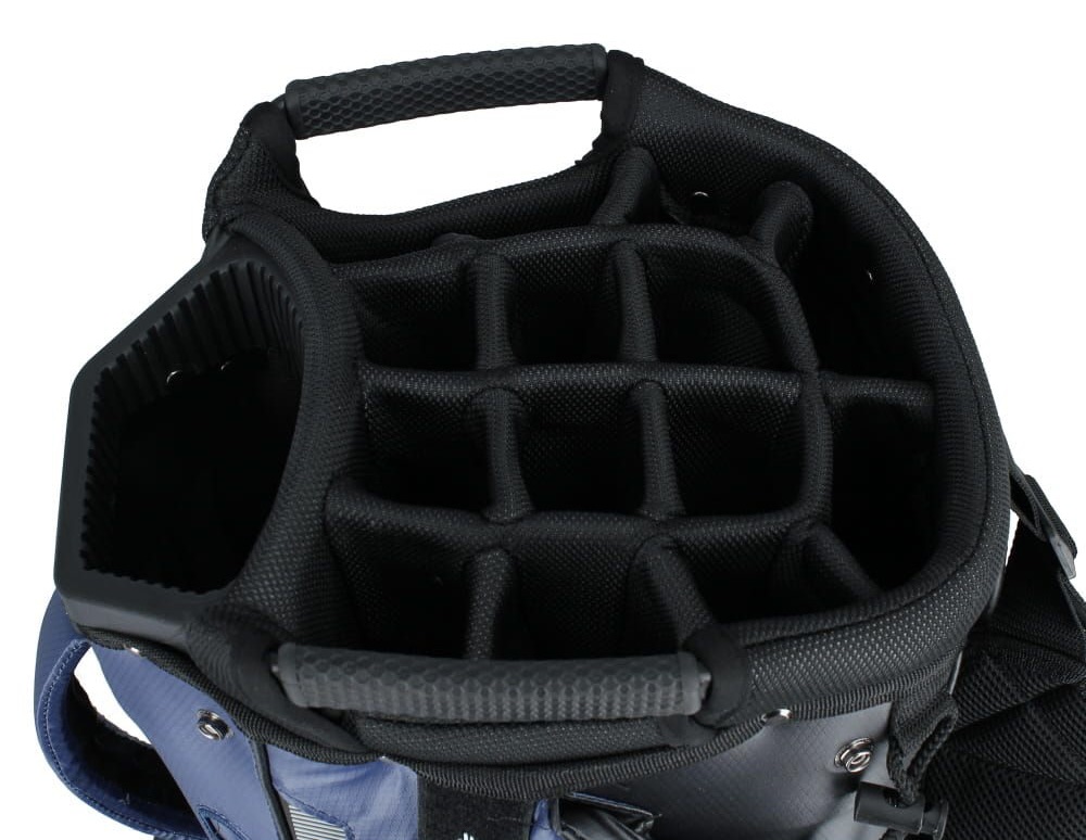 Boasting an 8-inch top with five-way full length dividers, its more than capable of carrying a full set of clubs, while also perfect for those casual rounds when you only want to play with a three-quarter set. A deluxe multi-point dual-harness shoulder strap with padding helps spread the load comfortably and evenly while padding down the side of the body enhances protection.