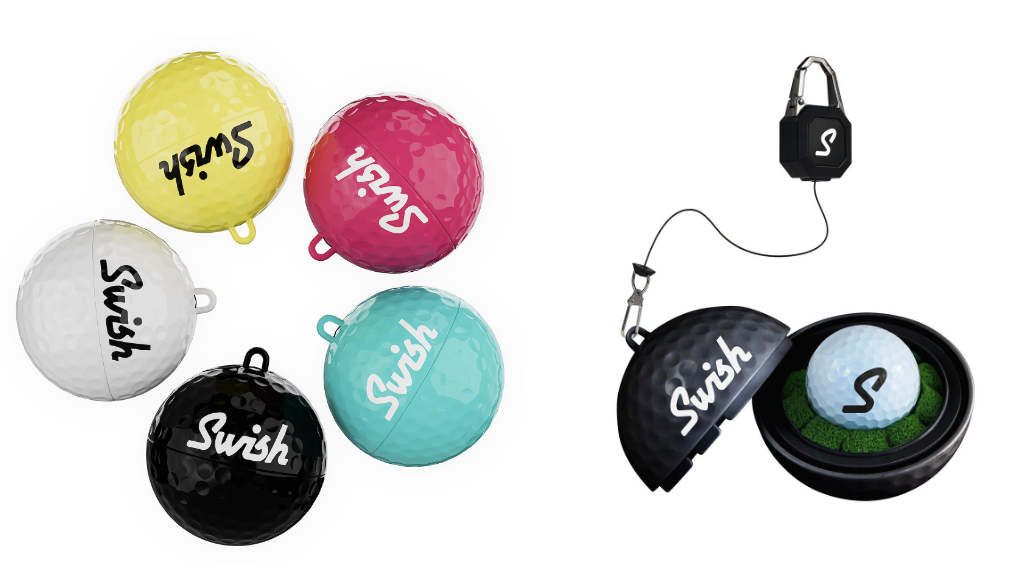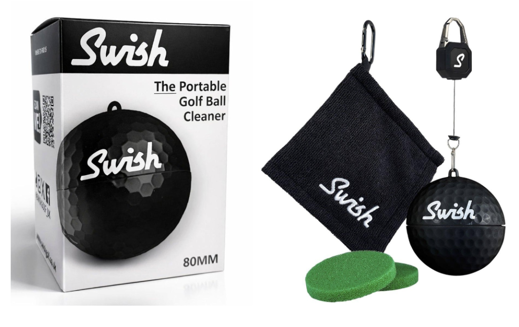 Shaped like an oversized golf ball, the SWISH golf ball cleaner features two specially formulated high-density cleaning inserts and a robust retractable tether with eight variable-length settings that extend up to 27.5 inches.