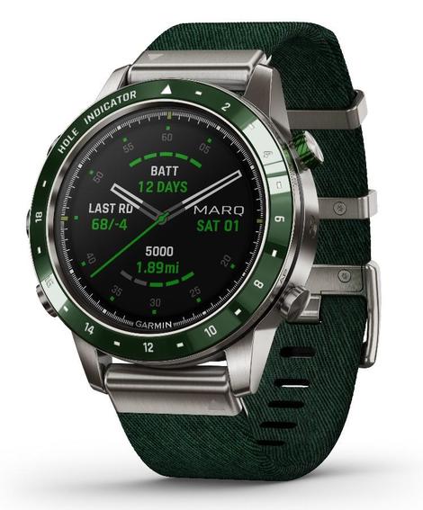 The Garmin Marq Golfer, which has a retail price of £1,699.99, boasts a 46mm titanium case and a ceramic bezel with custom etched 1-18 golf hole markings and a tritone green jacquard-weave nylon strap.