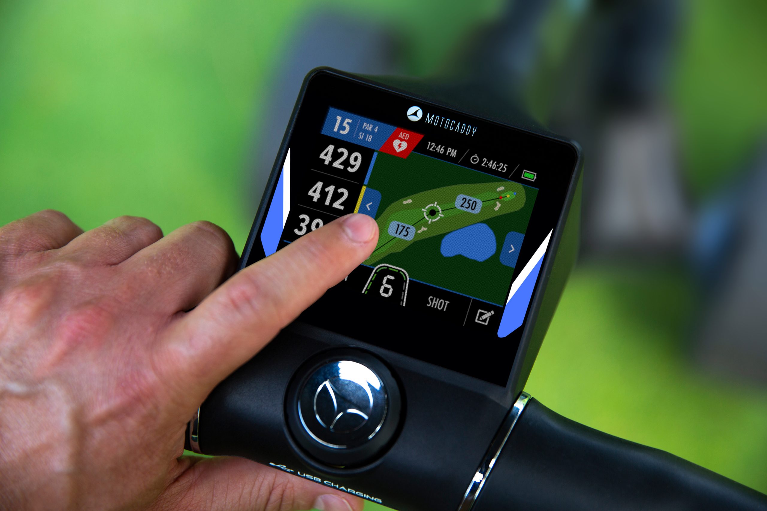 Other features visible directly through the trolley handle includes any hazard information on the hole, score tracking and the par of each hole, a clock and round timer, the ability to measure a shot, automatic hole advancement and a battery indicator. Potential life-saving defibrillator locations at the course can also be found on the screen, as well as CPR instructions for playing partners.