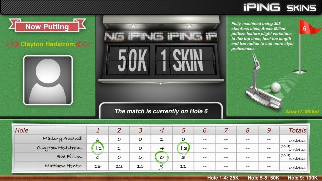 On each hole, a competitor rolls five 10-foot putts to establish his or her Consistency Score, reflected in a number similar to a golf handicap. The player with the best Consistency Score wins that hole and plays first on the next hole. iPING Skins Game also has a Party Mode for contestants in the same location. Party Mode uses AirPlay to show a live leader board on your HD television using your existing wireless network and an Apple TV.