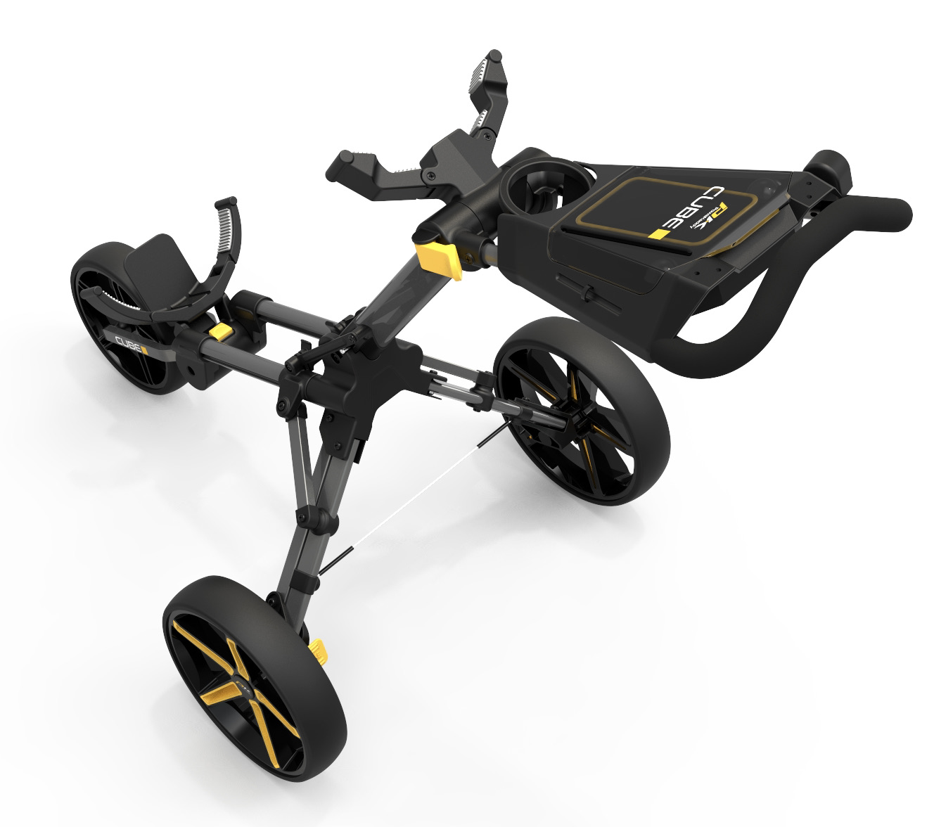 Brand new for 2021 is the PowaKaddy CUBE push cart. A lightweight, compact model with a simple folding mechanism, it boasts a compact 3-wheel design with a wide wheelbase for added stabilit. The soft-touch handle is adjustable, while there’s also mobile phone storage area. The black frame is offered in a choice of yellow, blue or red trims.