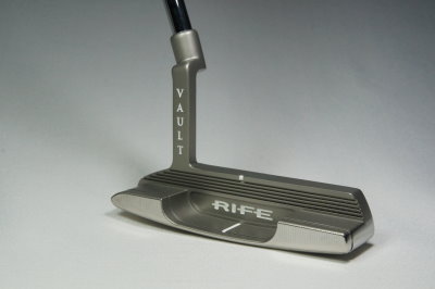 - TITAN – This bi-metal mallet is the largest putter in Rife’s Vault 001 series. Though it is large, it’s anything but clunky. The horizontal through cavity brings this putter weight in at 360 grams. The sleek tapering back comes to a centred tail point that is also the end of the sight line. This design makes aligning putts a breeze. SRP: £149.99 Finish: Black / Silver