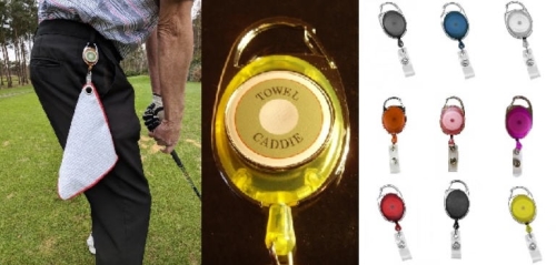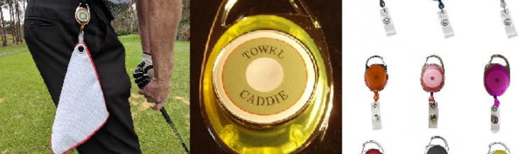 Retractable reels come in a choice of 9 colours and its metal flat ball marker has a 25mm printed resin dome held onto the retractable reel by a magnet. Strong enough to keep in place it is also easy to remove when required to mark the golf ball. Towel Caddie comes in various options which allow for customisation of the reel, towel and ball marker (it can be purchased with or without the ball marker).