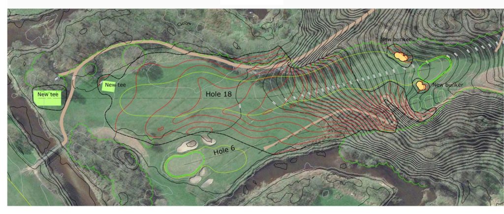 - A contour map of the whole golf course in PDF format, using a recent aerial photo of the course as a backdrop, at an agreed scale of 1:1000 or 1:1250 which is ready to print on an A1 or A0 sheet. The plan would incorporate the number and centrelines of each hole, and features such as the clubhouse, maintenance compound and practice area would be annotated. Contours can be provided at any interval that is requested, but would typically include 0.25m minor, and 1m major, contours. Dwg or dxf files, and printed copies of plans, at any scale, can be provided on request for a small additional fee.