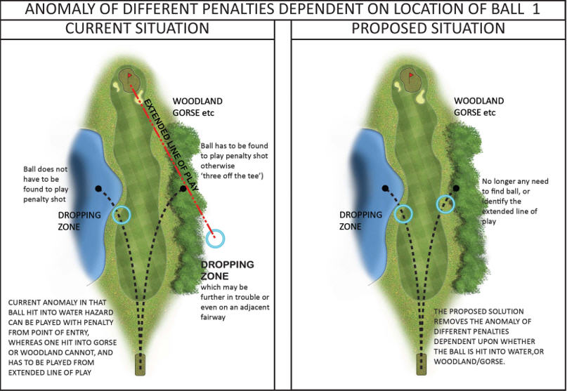 As background, a couple of years ago, we approached the R & A to propose a rule change which would allow ball finding devices to be used by golfers in competition. The purpose was to enable golfers to find their golf balls quickly, in order to speed up play, and to get rid of such a frustrating element of the game of golf; namely the lost ball. Finding a ball in deep rough within the allotted time requires good eyesight (to spot where the ball landed at distance), a fair level of luck, and owes a great deal to the searching skills of the golfers you happen to be playing with. For some reason the proposal to allow ball finding devices did not find favour, since it has not made it into the draft revision of the rules, but it did have one weakness as a concept which we recognised; namely, the fact that when a ball becomes lost it has often ended up in an unplayable area of the course, such as deep rough, where playing the ball or dropping another within two club lengths may prove futile. The option to drop a ball back on the extended line of play will often take the golfer into deeper trouble and so the golfer is then left with the only option being to return to the place he played his original shot from, thereby wasting time as illustrated by the left-hand illustration below. We would propose that a ball landing in deep vegetation is given the same penalty as one ending up in a lateral water hazard in order to speed up play and make the game more enjoyable as shown in the right-hand illustration.
