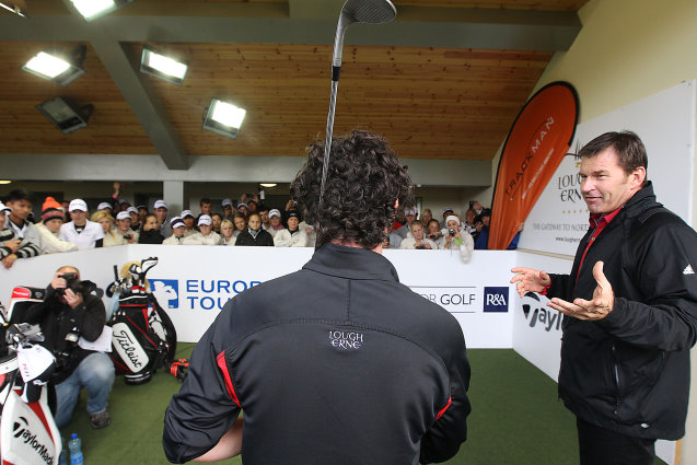 Rory McIlroy joined Sir Nick Faldo at Lough Erne Resort in Northern Ireland to give a clinic to competitors on day one of the fifteenth Faldo Series Grand Final. Earlier Jordan Smith of England and Ireland’s Victoria Bradshaw both posted two-over-par 74s to share the first round lead.