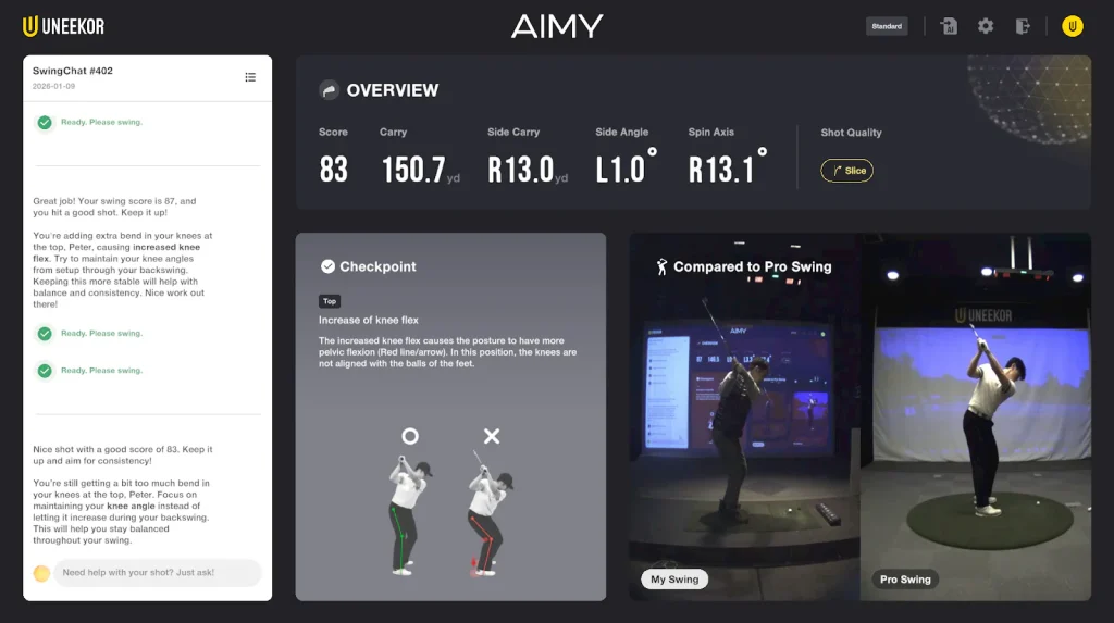The first is AIMY, a voice-activated AI assistant introduced as a new component of Uneekor’s AI Trainer interface. With its conversational guidance, AIMY allows golfers to engage in interactive, self-guided learning, while providing coaches a powerful tool for delivering data-informed instruction.