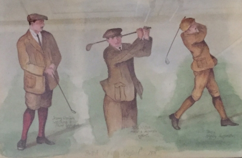 - Watercolour from the 1906 Open Championship, showing Braid, Hilton & Vardon, unknown artist (pictured)