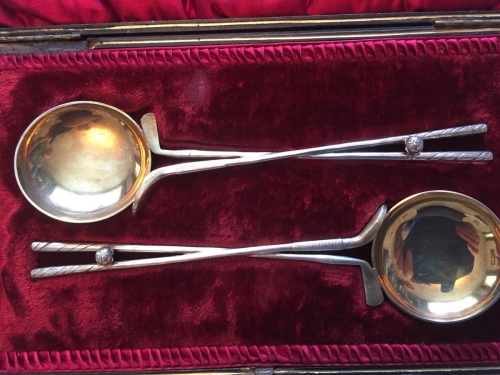 - Pair of Silver Gilt ‘CAPTAINS WINE TASTING SPOONS’ made by James Allan Co Sheffield circa 1860 (pictured)