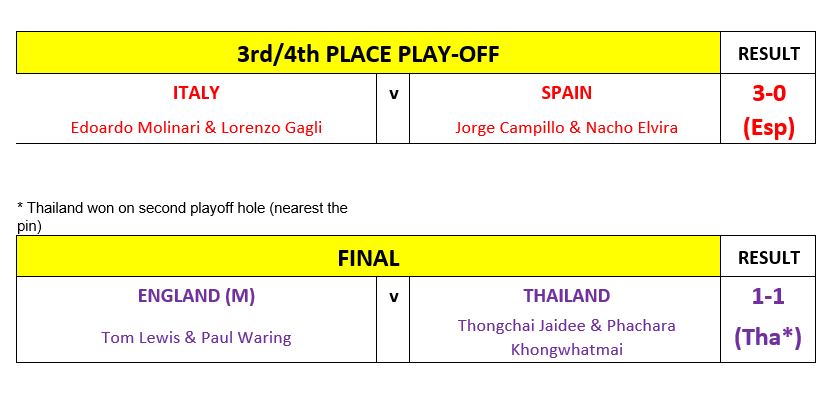 Spain overcame Italy in the third/fourth place play-off as Jorge Campillo and Nacho Elvira continued their respective purple patches on the 2019 Race to Dubai, beating Lorenzo Gagli and Edoardo Molinari.