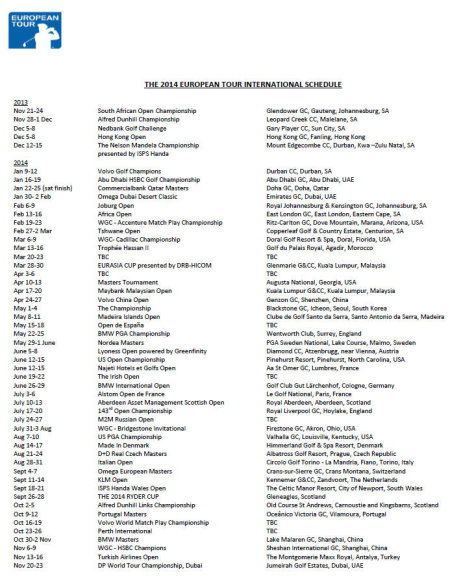 Keith Waters, Chief Operating Officer and Director of International Policy for The European Tour, said: “I am delighted with our 2014 schedule which perfectly showcases not only the renewed strength in depth of The European Tour, but also our influential global footprint.