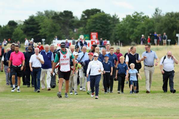 A predominantly male crowd are seen watching Celine Boutier and Moriya Jutanugarn on the 18th hole of the PRO AM at Royal Lytham and St Annes ahead of the 2018 Ricoh Women’s British Open, illustrating the ever-broadening appeal of the women’s game.