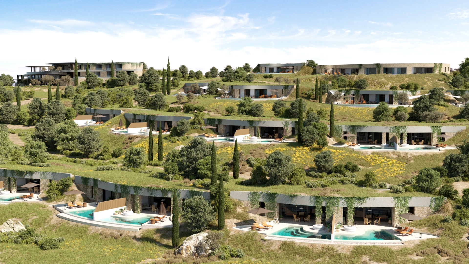 The resort has an earth-sheltered design with the buildings blending into the curved hillside with planted roofs. The design follows the natural topography of the land, using local materials, giving the impression that it has grown organically. The new hotel will feature a beach club, large swimming pool, destination spa, and various restaurants, bars, lounges and terrace spaces overlooking the Bay of Navarino.