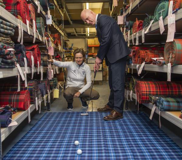 Scotland’s Minister for Public Health, Sport and Wellbeing Joe FitzPatrick and European Solheim Cup Captain Catriona Matthew have unveiled a specially commissioned tartan during a visit to Lochcarron of Scotland in Selkirk to celebrate The Solheim Cup returning to Scotland.
