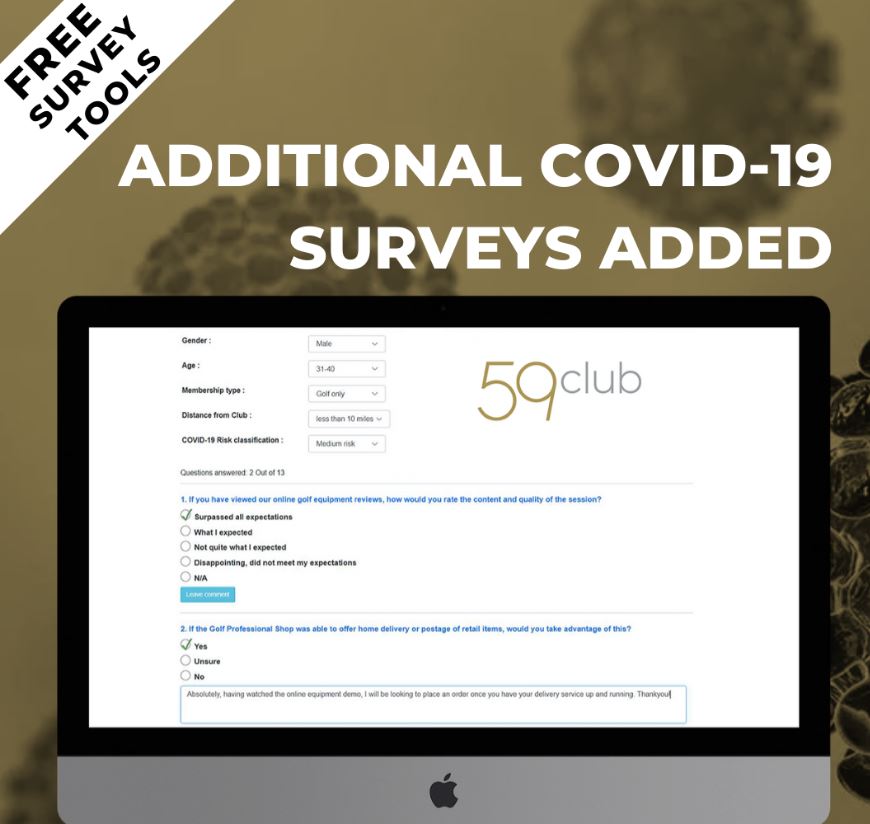 Additional Specific COVID-19 survey templates have and will continue to be added as part of 59club’s complimentary offering, covering all aspects of general member surveys, golf professional services, including retail, custom fitting & coaching and staff wellness surveys. The survey tools assist managers to glean feedback from its customers, members and staff amid the current crisis at specific times when the facility continues its limited offerings, at times when the offering/operation is forcibly closed, during the clubs renewal process, when dealing with membership cancellations and in the run-up to the club/facilities reopening.