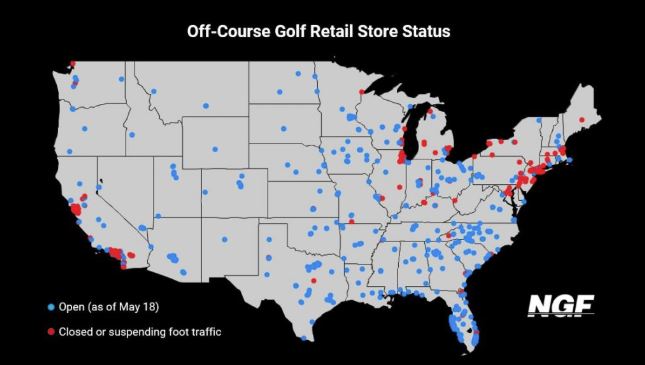 The percentage of off-course golf specialty stores open to foot traffic jumped from 61% to 75% last week in the National Golf Foundation’s latest industry-wide surveys. On-course pro shops are following close behind with 63% now open, up from 52% the prior week.