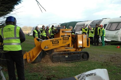 Then it was outside to see product demonstrations, the first of which was the Carlton SP7015TRX stump grinder. This model is one of the largest of its kind available in the UK and is a ‘go anywhere do anything’ machine that makes light work of any size stump. It provides big cutting power from a massive 1780mm cutting arc and offers and impressive 1060mm cutting height above ground and 340mm below. The power from the 66HP turbo diesel engine was evident as it made short work of the stump. Following this was the SP5014TRX, a compact, powerful and reliable stump grinder with a 1090mm cutting arc providing a 355mm cutting depth below ground. Both machines are radio remote controlled to increase operator visibility, usability and safety.