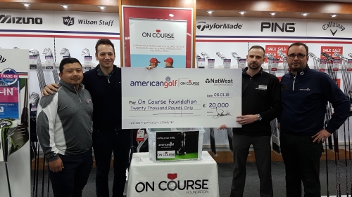 The money was raised by the American Golf Christmas raffle held across the company’s 121 stores in the run up to Christmas. Nick Dougherty, Sky Sports presenter and On Course Foundation Ambassador, was on hand to draw the winners of the raffle live on Facebook and receive the staggering £20,000 cheque from Regional Area Sales Manager David McGlone.