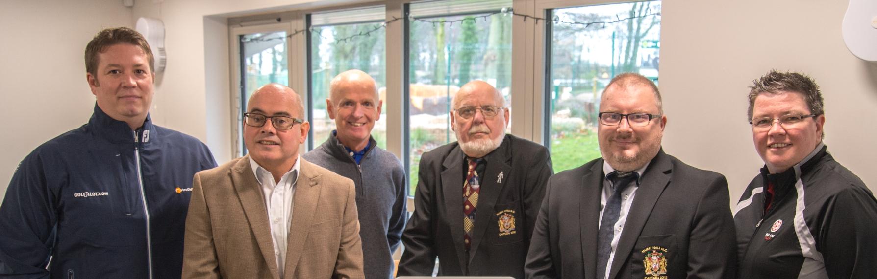 The picture above shows (L-R) Darren Wood (relationship manager, Club Systems International); Steve Eyres (honorary secretary, Haigh Hall GC); Ian Lee (head professional, HHGC); Keith Bergman (general manager destination parks, Healthy Lifestyles); Johnathan Shepherd (HHGC captain); and Gemma Hunter (England Golf’s handicap and course ratings manager).