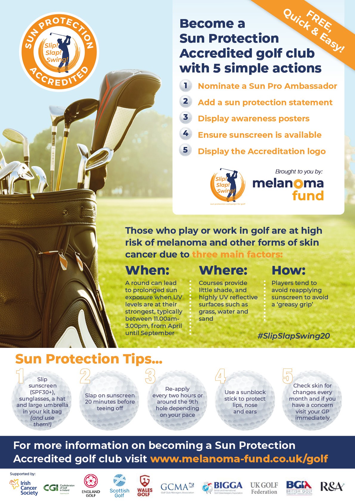 For further information visit the Melanoma Fund’s Slip! Slap! Swing! campaign at www.melanoma-fund.co.uk/golf #SlipSlapSwing20