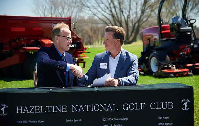 The Toro Company and Toro distributor, MTI Distributing, have finalised an 11-year equipment and tournament support agreement with Hazeltine National Golf Club in Minnesota. Leaders from Hazeltine National and Toro gathered at the course on April 26 for a ceremonial agreement signing.