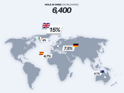 It found that, of the 6,400 holes in one that have been recorded in this time, 15% have come from the UK. This puts the UK at the top of the league table with double that of its nearest rival Germany (7.5%). The other nations making up the top five are: Spain (4.7%), Australia (4.1%) and Ireland (4%).