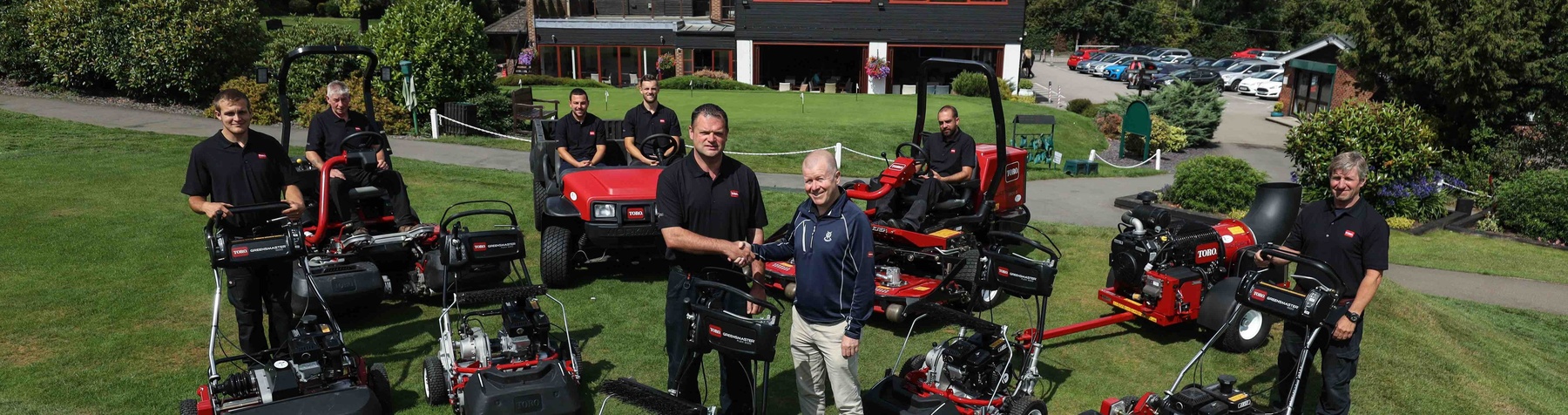 Pictured Course manager Jeff Foulger, right, shakes hands with Reesink Turfcare’s Richard Freeman, alongside the greenkeeping team and the club’s new Toro fleet