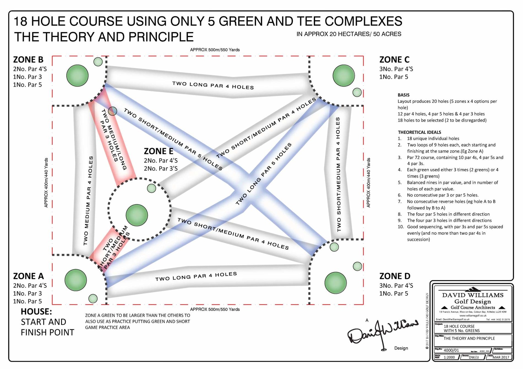 With the star shape of the site, greens and tees were generally positioned in the points of the star, with all drives being directed to a fairly central landing area. As such, utilising only five greens would not give the difference of play essential to translate the concept into reality.