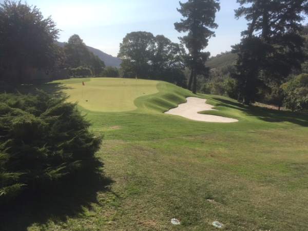 The final hole, a dramatic downhill par 3, is in its own separate valley finishing immediately in front of the house, leaving eight greens to be sited within the main star-shaped area of the site. It is also used as a practice putting green, as well as being the focus for short game practice.