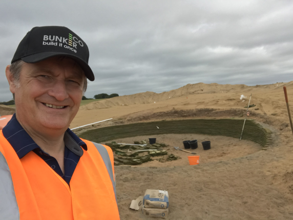 The EcoBunker team, led by Global Construction Specialist Llewellyn Matthews (like course designer Clive Clark a former Walker Cup player) began work in June, only a few weeks after the course construction began. Their challenge was to construct the seventy pot bunkers (1,028 sq m of revetted face) over a sixteen week contract period, while staying ahead of and avoiding conflict with all the other active contractors on the site. Matthews and his team helped to plan the programme of works and moved onto each hole as soon as it had been rough shaped and constructed the bunkers in the native sand.